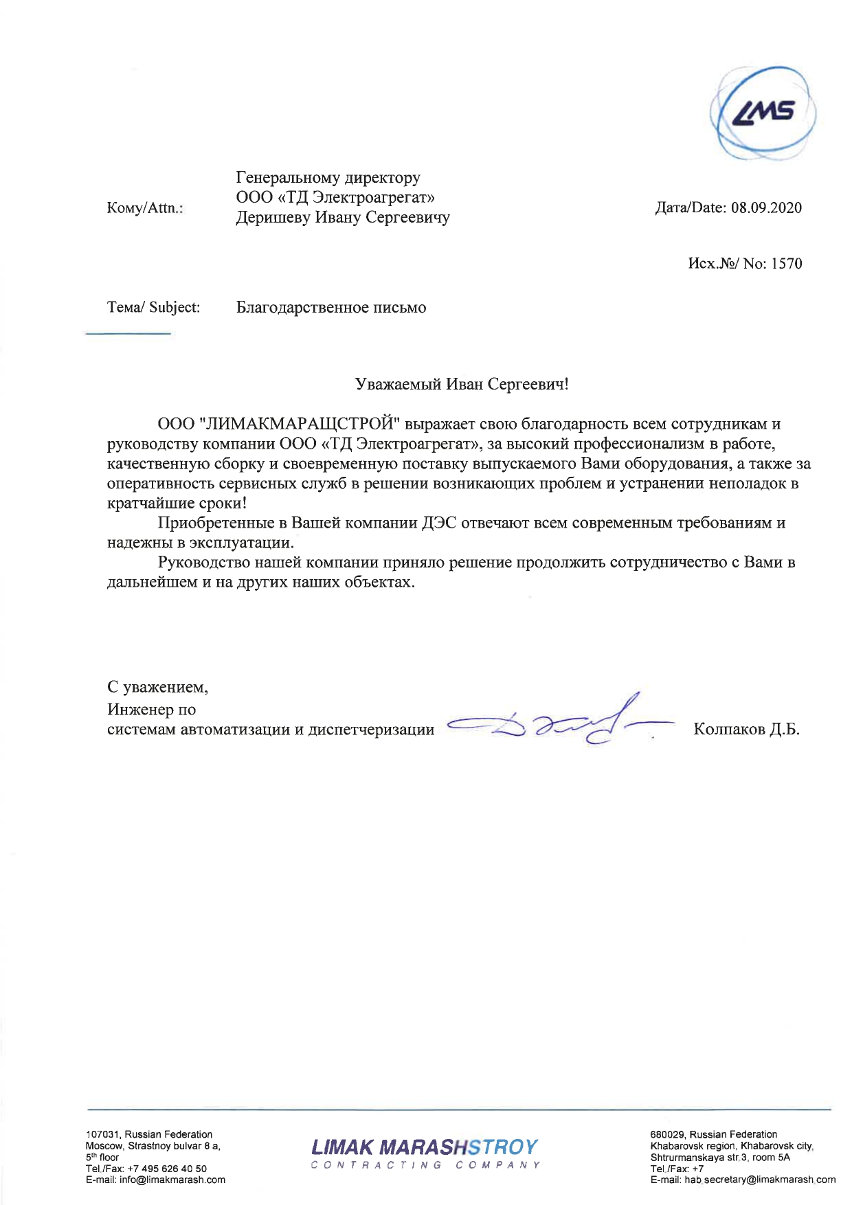 Отзыв контрагентов о компании ООО «ТД Электроагрегат» и  исполненном проекте для ООО "ЛИМАКМАРАЩСТРОЙ"